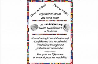 Geplaatst op 19 oktober 2025 15:00Op zaterdag 1 november ga ik naar een CAVIA EVENT in Eindhoven !!! Dus kijk eens op mijn website bij "Toebehoren Cavia's" en/of "Voor hun baasjes" of je nog wat leuks ziet . Zoja , laat het dan even weten, dan zorg ik dat ik het bij mij heb !!! ( Intree is gratis ) |